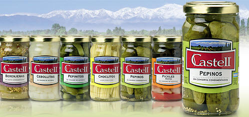 食品瓶貼設計,Castell食品瓶貼設計欣賞,將主食品與食品名稱等信息設計在瓶貼的展示面上,圖片色彩亮麗,名稱的開頭字母設計有點藝術化,整體的色彩搭配很有格調,設計風格很有美感。