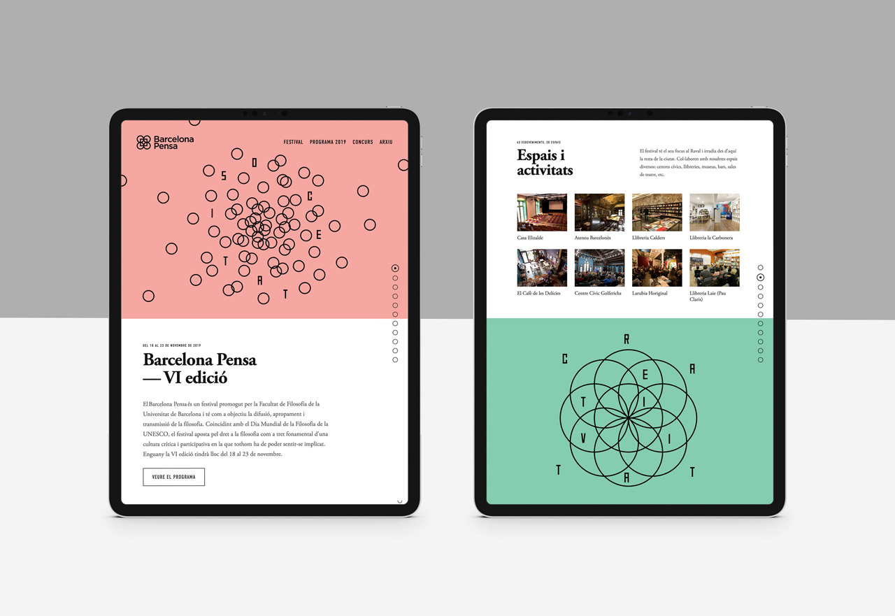 A philosophy festival composed of many independent events. On the sixth edition of the film festival held in 2019, more than 40 events were held, divided into six main pillars, each with its own graphic representation to arouse reflection. These pillars are society, memory, equality, knowledge, existence and creativity. In addition to creating a print design, another brand promotion was also designed, including responsive websites, posters, postcards, and handbags.